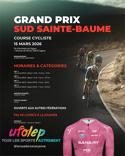 L’UFOLEP est fière d’annoncer le Grand Prix Sud Sainte-Baume, une grande course cycliste qui se tiendra le dimanche 15 mars 2026 sur la Zone d’Activités de Signes (Avenue de Rome – 83870 Signes).